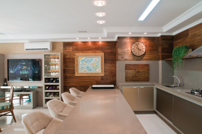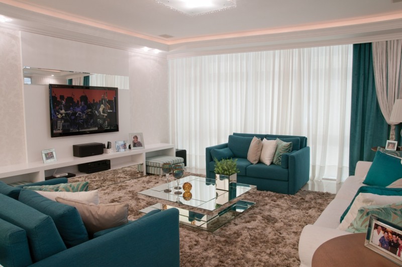 Diante da disposição dos clientes, a dupla fez uma sugestão ousada para estabelecer o contraste esperado: verde esmeralda. Eleita pela empresa Pantone como a cor do ano, a tonalidade agradou. É no living que ela se destaca. “Entre os espaços do estar com TV e do jantar, observamos uma sequência no estilo que tem nos tons de verde o pulsar do ambiente”, define Silvia. Nuances de bege, branco e o castanho da madeira harmonizam-se no conjunto.